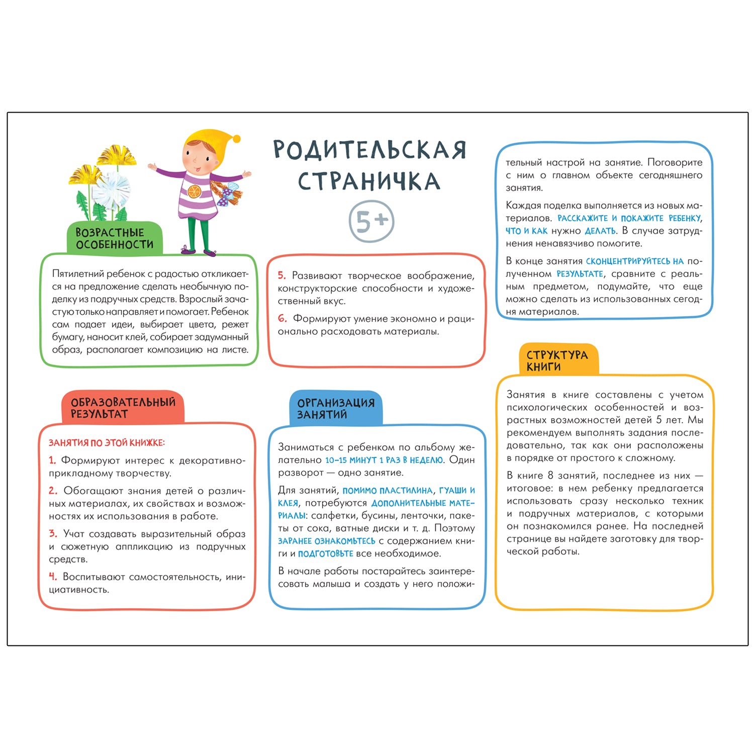 Все задания в книгах выстроены от простого к сложному и следуют принципу «развитие через игру». Заниматься с ребенком может любой взрослый, специальных знаний и опыта не требуется. Родительская страничка в каждой книге подскажет, что, как и почему нужно развивать в данном возрасте.